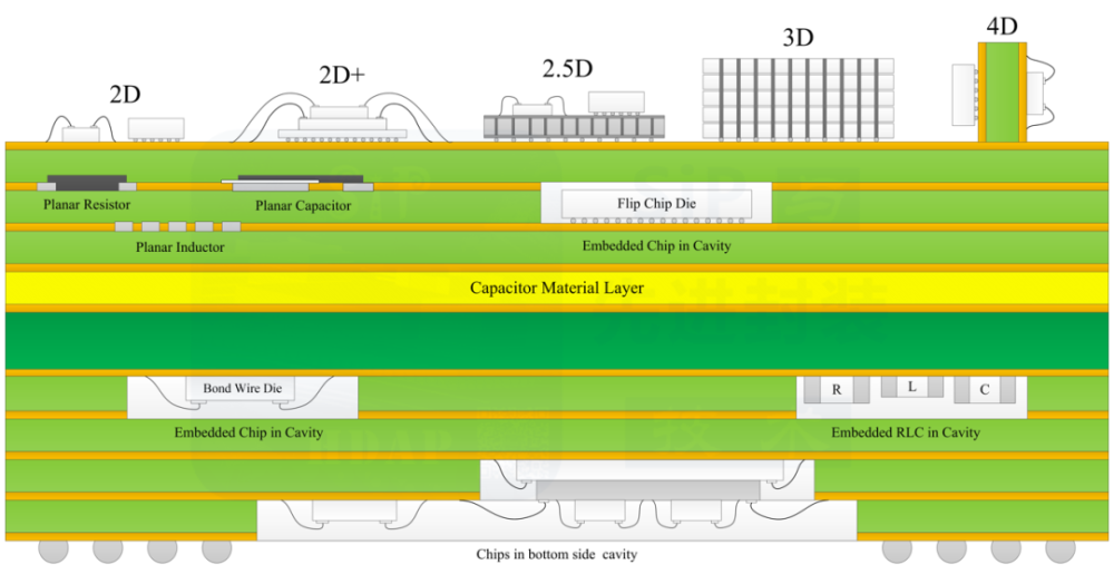 在下面一张图中,我们将7种集成技术汇聚到了一个设计中,让它们来一个大团圆。在基板的表面从左至右分别是2D, 2D+,2.5D, 3D, 4D五种集成,在基板内部则包含了Cavity和Planar两种集成。